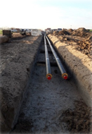 Ondertussen hadden we een plek toegewezen gekregen in deelplan 9 voor het regelstation. Je snapt het al, dan moet er een leiding van deelplan 9 naar deelplan 5 gelegd worden. Dit trace heeft MVOI voor ons aangelegd van november 2020 t/m februari 2021. In dit trace zitten 4 kunstwerken, zinkers om de watergangen te kruisen. Al met al een hele klus.